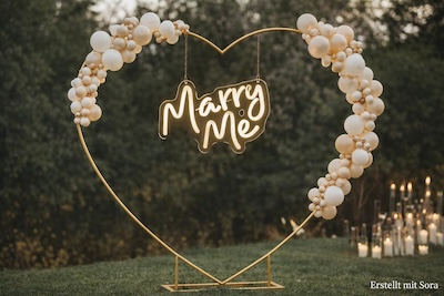 Dekoriere den Herzbogen mit ein paar Luftballons und unserem Marry Me LED Sign (siehe oben) für Deinen Hochzeitsantrag. Der Bogen wird in wenigen Minuten zusammengesteckt, ist relativ leicht und passt auseinander gebaut in ein kleines Paket. Vervollständige das Setting gern mit unseren Windlichtern.