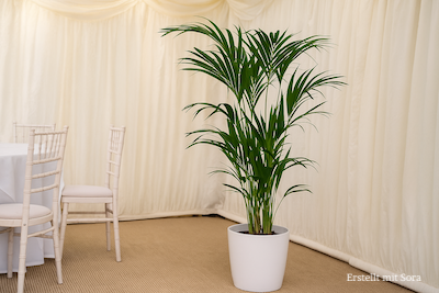 Die Goldfruchtpalmen erhaltet ihr in einem weißen Übertopf und sie sind super geeignet, um eine hässliche Ecke in einer Location zu verdecken oder falls Euch einfach etwas Grün fehlt.