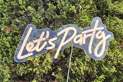Die pinken Leuchtbuchstaben sind batteriebetrieben und freistehend. Der perfekte Spot für die Leuchtdeko ist bei der Tanzfläche.